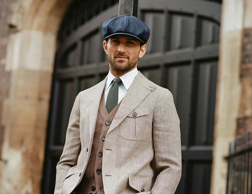 Created to celebrate the 60thanniversary of James Bond in 2022, this is a very special eight-piece cap in an exclusive Escorial wool navy herringbone. Inside, a unique patterned lining distinguishes this as a future classic