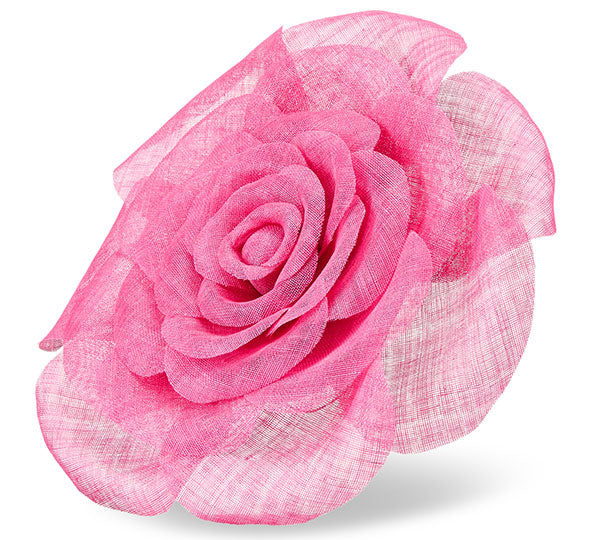 A dramatic statement in sculptural form, this oversized pink rose hat is crafted from sinamay, creating a bold yet refined silhouette with striking presence.